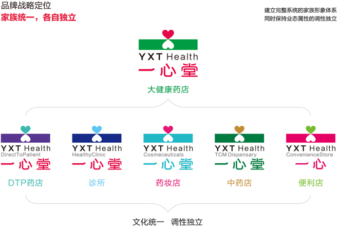 一心堂未來是要構(gòu)建多業(yè)態(tài)大健康產(chǎn)業(yè)鏈的,集團(tuán)旗下會有很多業(yè)態(tài),那么怎么才能先通過品牌外在形象實(shí)現(xiàn)一開始定下的“家族統(tǒng)一,業(yè)態(tài)獨(dú)立”的品牌戰(zhàn)略定位呢?