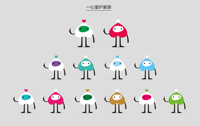 因?yàn)椴煌瑯I(yè)態(tài)的品牌形象已經(jīng)發(fā)生轉(zhuǎn)變,在加強(qiáng)單個(gè)業(yè)態(tài)內(nèi)與品牌形象的關(guān)聯(lián)性的同時(shí)配合品牌進(jìn)行調(diào)整。他們的形象不變,名字不變,他們永遠(yuǎn)是“一一”和“心心”,只是身上的顏色(衣服)發(fā)生了變化。這樣,整個(gè)IP家族就是一心堂業(yè)態(tài)的代表。