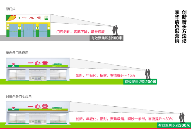 經(jīng)過我們李華清研究小組的測算分析,如果一心堂原來的門頭只能讓人在百米開外看到,那么加了色條的門頭就能夠在200米內(nèi)引導(dǎo)人們的視線;而將綠色條下再襯以高反差的紅色,就能夠在300米內(nèi)視線聚焦。讓整條街道都能看到一心堂,實(shí)現(xiàn)焦點(diǎn)引流。