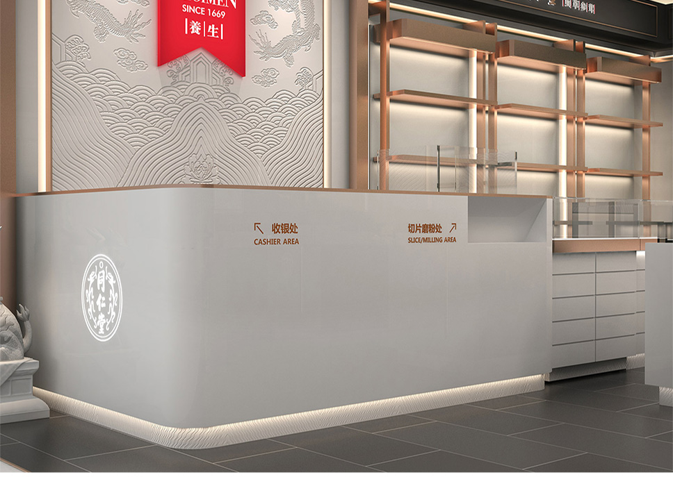 采用深灰、白和玫瑰金色搭配,使整體店面既有富麗堂皇之氣場(chǎng),也有清新脫俗之雅韻。一方面與同仁堂傳統(tǒng)店面形象區(qū)分開來,另一方面在傳承同仁堂文化的同時(shí)也對(duì)同仁堂形象進(jìn)行了升華,使其店面更具視覺特點(diǎn)和識(shí)別性;更加現(xiàn)代時(shí)尚,符合未來人群的審美情趣。